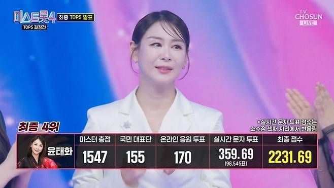 나훈아의 '망모'를 선보인 윤태화는 "할머니 슬하에서 자랐다. 일찍부터 고생을 많이 하셨는데, 일찍 돌아가셔서 할머니의 사랑을 떠올리며 불렀다"라고 고백했다. 장윤정은 "과하지 않았다. 그럼에도 잘했다"라며 높은 점수를 줬다고 말했고, 윤태화는 1,547점으로 1위에 올랐다.