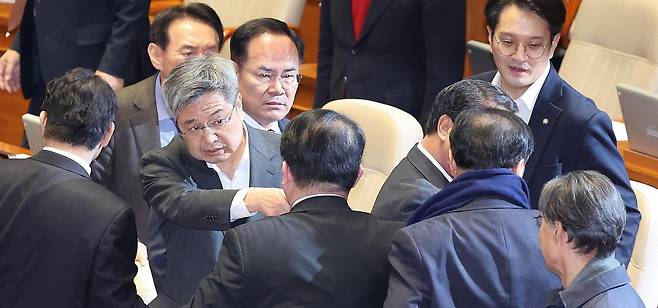 | 與 박선원 “야, 인마”… 국회 ‘방미통위’ 충돌 국민의힘 의원들이 26일 서울 여의도 국회에서 열린 본회의에서 국민의힘 몫 방송미디어통신위원회 천영식 상임위원 후보자 추천안이 부결된 뒤 더불어민주당 의원들을 향해 항의하고 있다. 이 과정에서 민주당 박선원 의원이 국민의힘 의원들을 향해 “야, 인마”라고 소리쳤고, 국민의힘 의원들이 “야, 인마가 뭐야”라고 강하게 항의하면서 거친 설전이 이어졌다. 뉴스1 |