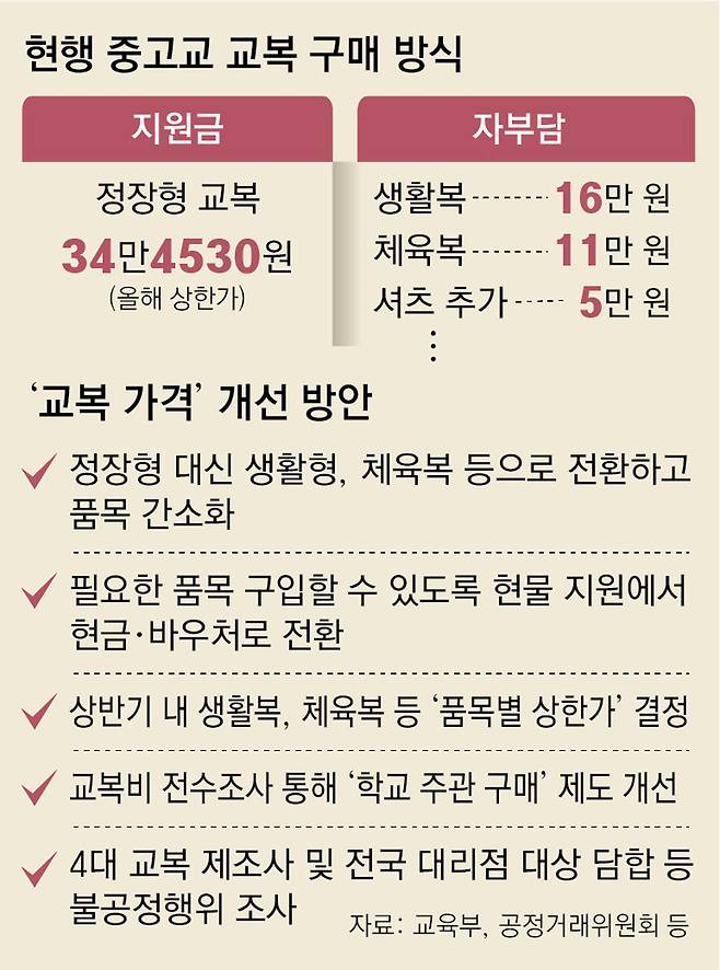 개선 방안에 따르면 교육부는 정장형 교복을 활동하기 편한 생활복, 체육복 등으로 전환하고 품목도 간소화하기로 했다. 생활복, 체육복과 비슷한 바지와 티셔츠 등 시중 제품 착용을 허용하는 방안도 추진한다.