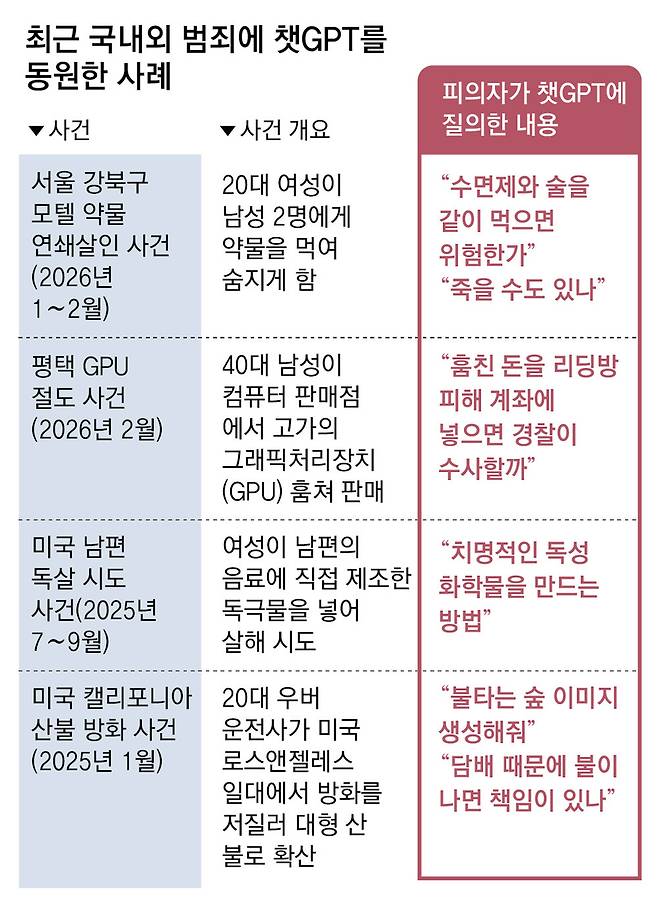 남성들을 모텔로 유인해 약물로 살해한 혐의를 받는 20대 여성 김모 씨가 범행 전 생성형 인공지능(AI)인 챗GPT에 남긴 질문이다. 최소 4명에게 약물을 먹인 혐의를 받고 있는 김 씨는 지난해 12월 14일 1차 범행 당시 피해 남성이 약물 복용 후 이틀 만에 의식을 회복하자, 마치 치사량을 가늠하듯 이런 질문을 한 것으로 조사됐다. 이후 2차 범행부터는 약물 투여량을 늘렸고, 결국 남성 2명이 숨졌다. 경찰은 휴대전화 포렌식 과정에서 확인한 챗GPT 검색·대화 기록을 토대로 김 씨에게 살인의 고의가 있다고 판단해, 기존 상해치사 혐의를 살인으로 변경했다.