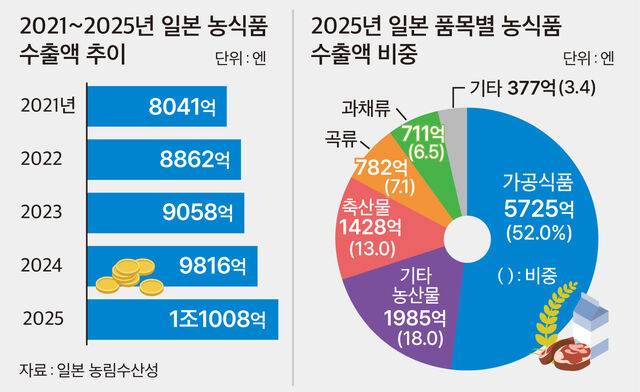 일본 농림수산성이 최근 발표한 '2025년 농림수산물·식품의 수출 실적'에 따르면 지난해 일본의 농식품 수출액(임산물·수산물 제외)은 1조1008억엔(10조2700억원)이었다.