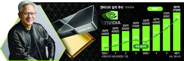 에이전트(비서)형 인공지능(AI) 확산으로 엔비디아 실적이 사상 최고치를 경신했습니다. 엔비디아는 2026회계연도 4분기(지난해 1월~올해 1월)에 전년 대비 73% 증가한 681억 2700만 달러의 매출액을 기록했습니다. 젠슨 황 엔비디아 최고경영자(CEO)는 “에이전트형 AI가 ‘챗GPT 순간’을 맞았다”며 ‘변곡점’이라는 표현을 언급했습니다. 에이전트형 AI가 기존 대비 3~10배 많은 칩을 필요로 해 엔비디아에는 호재이기 때문입니다.