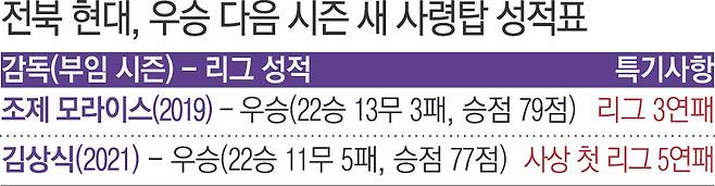 2019년 조제 모라이스 감독은 최강희 감독이 2018년 우승시키고 떠난 전북의 지휘봉을 이어받았다. 곧바로 우승했다. 울산 현대와 승점 79점으로 동률을 이룬 끝에 다득점(전북 72골, 울산 71골)에서 앞서며 극적인 역전 우승에 성공했다. 모라이스 감독은 2020년까지 2년 연속 우승을 이끌며 전북의 리그 4연패를 만들고 물러났다. 2021년 지휘봉을 이어받은 김상식 감독도 우승시켰다. 승점 76점으로 K리그 사상 첫 리그 5연패의 대업을 완수했다.