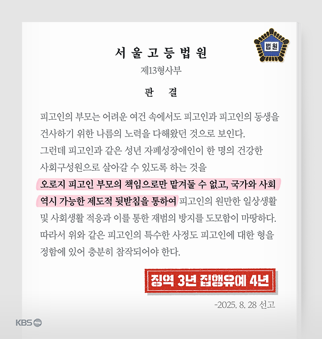 판결문에는 성인 자폐성 장애인을 돌보는 일을 부모의 책임으로만 맡겨둘 수 없다며, 재범 방지를 위해 국가와 사회에도 책임이 있다는 점이 명시됐습니다.