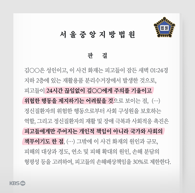 감독 의무가 있는 건 맞지만, 24시간 내내 아들의 위험한 행동을 제지하기는 어려웠을 테고, 정신질환자에 대한 책임은 개인만이 아니라 국가와 사회에도 있다는 점을 참작했습니다.
