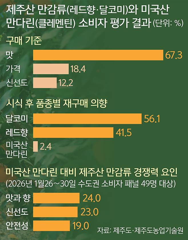 품종별 소비자 선호도는 달코미가 가장 높았고 레드향, 미국산 만다린 순으로 나타났다. 감미비와 식감, 과즙 항목에서 제주산 만감류가 높은 점수를 받으며 종합적인 맛의 완성도에서 우위를 보였다. 시식 후 재구매 의향에서는 제주산 만감류가 달코미 56.1%, 레드향 41.5%로 전체 97.6%를 차지한 반면 미국산 만다린은 2.4%에 그쳤다.