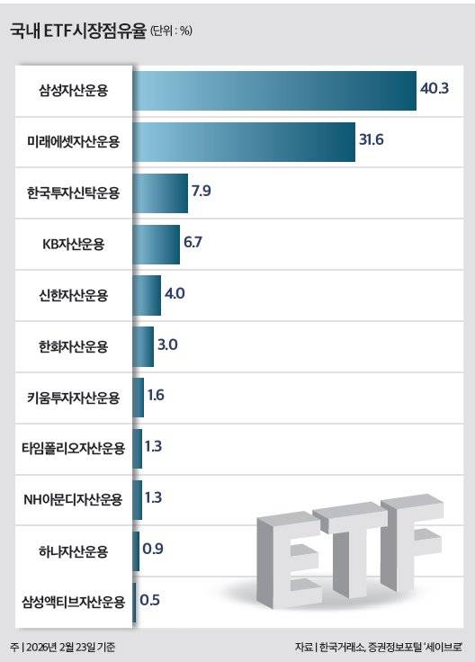한국거래소에 따르면 2월 23일 기준 국내 ETF 순자산 규모는 약 371조3667억 원이다. 약 298조2461억 원이던 연초 대비 약 25% 오른 것이다. 증권정보포털 '세이브로'에 따르면 운용사별로는 삼성자산운용이 약 149조6590억 원으로 순자산이 가장 많았다. 연초 약 114조1512억 원에서 31% 증가했다. 시장점유율은 38.3%에서 40.3%로 올라 2024년 3월 말 이후 약 1년 10개월 만에 점유율 40%대를 회복했다(그래프 참조). 이어 미래에셋자산운용(117조1686억 원), 한국투자신탁운용(29조5113억 원), KB자산운용(24조9362억 원) 순으로 순자산이 컸다.