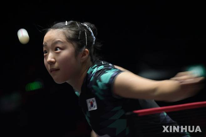 [싱가포르=신화/뉴시스] 신유빈이 26일(현지 시간) 싱가포르에서 열린 2026 월드테이블테니스(WTT) 싱가포르 스매시 여자 단식 16강전에서 왕만위(중국)와 경기하고 있다. 신유빈이 1-3(21-19 7-11 8-11 11-13)으로 패해 8강에 오르지 못했다. 2026.02.27.