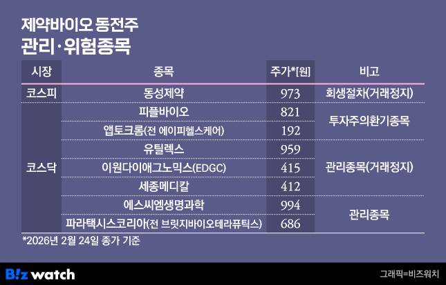 세종메디칼·유틸렉스·에스씨엠생명과학·이원다이애그노믹스·파라택시스코리아·피플바이오·앱토크롬·동성제약 등 8곳은 상장폐지 대상에 오르거나 관리종목 또는 투자주의환기종목으로 지정된 상태다.