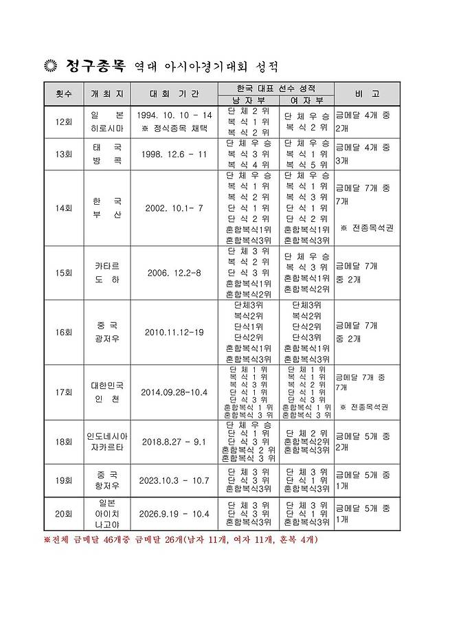 처음 정식종목으로 채택된 1994년 히로시마 아시안게임에서 이명구-유영동 조가 남자 복식 정상에 오른 것을 시작으로 지난 항저우 아시안게임까지 8개 대회에서 전체 금메달 46개 가운데 26개를 수집했습니다. 금메달 확률이 절반도 넘는 56.2%에 이릅니다. 특히 '안방'에서 열린 2002년 부산과 2014년 인천에서는 7개 전 종목 석권이라는 금자탑도 쌓았습니다.