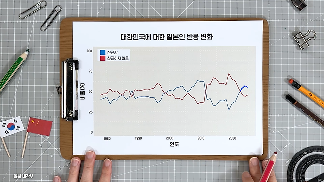 반면 우리나라는 다릅니다. 우리나라에 대한 일본인의 감정은 고착화되어있지 않고 왔다 갔다 해요. 지금은 긍정적인 인식이 더 많은 상황이라 이 여론을 살피지 않을 수 없겠죠.