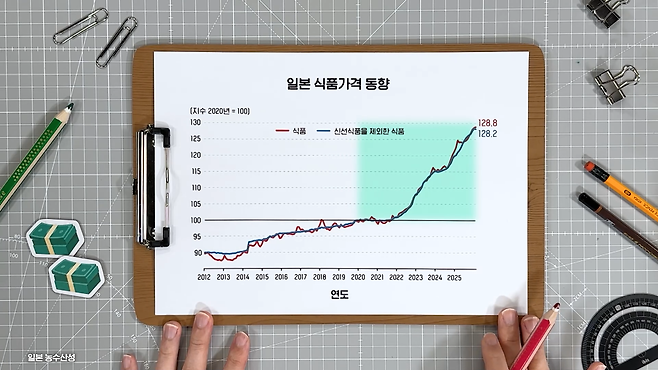 일본 농수산성에서 제공해 주는 식품 물가 상승 데이터입니다. 2020년을 100으로 봤을 때 최근 상승세는 상당히 가파릅니다. 특히 생필품 가격이 폭등하면서 서민 경제에 큰 타격이 되고 있어요.