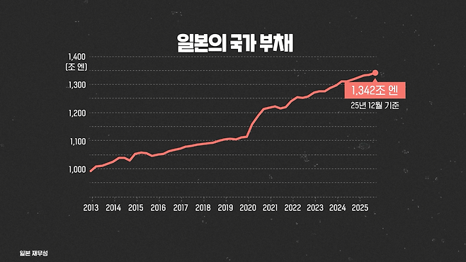 일본의 국가 부채는 2025년 말 1,342조 엔을 기록하고 있습니다. GDP 대비 국가 부채 비율은 240%에 가깝죠. 참고로 미국이 100% 수준이고 우리나라가 50%를 목전에 둔 상황이니 일본의 이 숫자가 얼마나 큰지 감이 오실 겁니다.