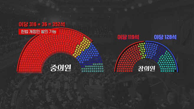 중의원에서 전체 의석의 3분의 2 이상을 확보한 만큼 헌법 개정안 발의는 가능합니다. 하지만 그다음 단계인 참의원에서도 3분의 2 이상의 찬성이 필요하죠. 현재 참의원은 여전히 여소야대 상황인지라 시간이 걸릴 수밖에 없을 겁니다.