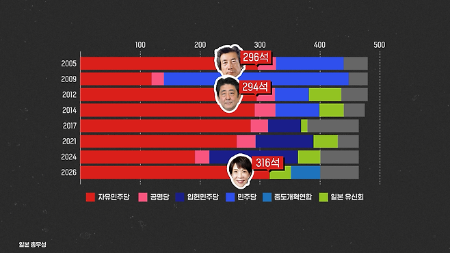 다카이치 사나에 총리의 자민당은 일본 중의원 선거에서 역대 최다 의석인 316석을 확보하여 개헌안 발의가 가능한 2/3 이상의 의석을 차지했습니다.