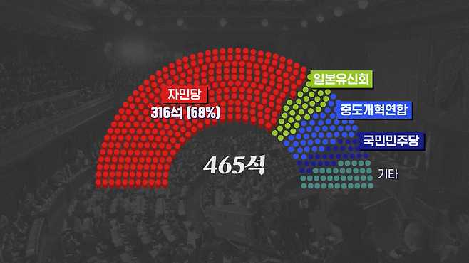 전체 465석 가운데 68.0%가 자민당 의석으로 전체의 3분의 2를 넘겨버렸죠. 1945년 태평양전쟁 종전 이후 한 정당이 일본 중의원에서 3분의 2가 넘는 의석수를 갖게 된 건 이번이 처음입니다.