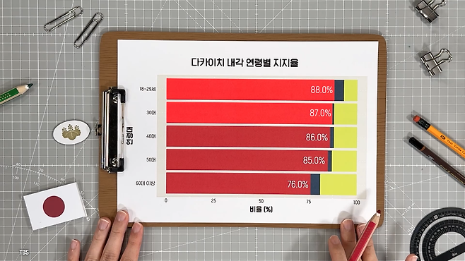 세대별로 보면 전 세대에 걸쳐 75% 이상의 지지율을 받고 있고, 특히 30대 미만의 유권자들은 압도적으로 다카이치를 지지하고 있죠. 다른 여론조사에서는 20대 지지율이 92.4%까지 나올 정도로 젊은 층의 지지세는 상당합니다.