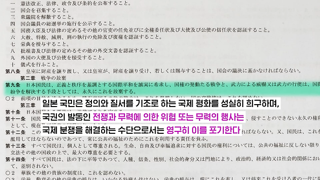 1947년 제정된 일본의 평화헌법 제9조에는 전쟁 포기와 군대를 보유하지 않는다는 내용이 명시되어 있습니다. 하지만 앞서 언급한 아베 총리의 안보법으로 일본 자위대가 직접 공격받지 않아도 무력행사는 이미 가능하게 되었죠. 다카이치는 더 나아가 헌법 9조를 개정해 자위대를 헌법에 명기해야 한다고 주장해 왔습니다.