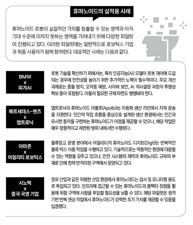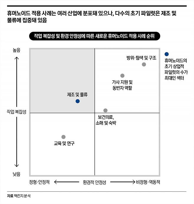 최초의 파일럿에는 지도화된 공장 통로, 통제된 물류창고 레인, 일상적인 검사 경로와 같이 정형화돼 있고 가변성이 낮은 환경에서 반복적이면서 중간 정도의 복잡성을 가진 작업을 수행하는 휴머노이드가 포함됐다. 이러한 환경에서는 현재 수준의 이동성과 기본적인 처리 능력만으로도 가치 창출이 가능함이 입증됐다.