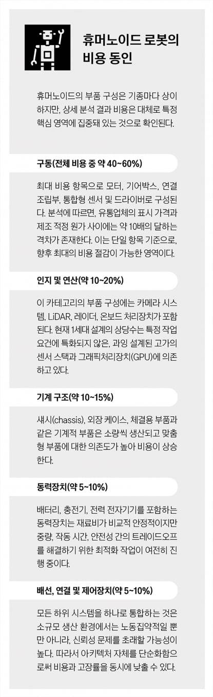 정교한 조작 능력과 안전성이 로봇의 역량을 규정한다면, 비용은 상용화의 실현 가능성을 결정한다. 휴머노이드가 새로운 능력을 확보하고 작업장에서 자유롭게 이동할 수 있다고 하더라도, 비용이 합리적이지 않다면 대규모 확산은 불가능하다. 현재 프로토타입 제품의 단가는 대당 15만~50만 달러에 달한다. 초기 세대의 휴머노이드가 기술적 타당성에 집중하고 있어, 막대한 자원을 투입하고 있다는 점을 감안하면, 크게 놀라운 일은 아니다.