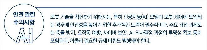진정한 가치는 격리된 울타리 안에서 작업하는 것을 넘어, 인간과 함께 작업장과 공공장소에서 공존할 수 있는지에 달려 있다. 이로 인해 안전 기준이 한층 더 높아졌다. 이에 대응하기 위해서는 규제적·기술적 측면 모두에서의 브리지 구축이 반드시 병행돼야 한다.