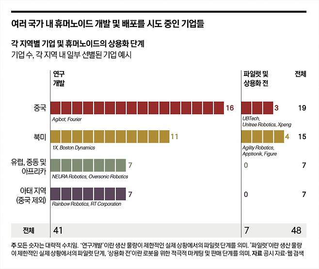 전 세계적으로 약 50개 기업이 휴머노이드 로봇과 관련한 목표를 발표했지만, 파일럿의 확대 적용이나 상용화 전 배포 단계에 도달한 기업은 10곳이 채 되지 않는다. 대다수 기업은 아직 연구개발 단계에 머물러 있으며, 실험실이나 매우 통제된 환경에서 프로토타입을 테스트하는 수준에 그치고 있다. 이러한 상황은 경영진들은 두 가지 핵심 질문을 던져야 한다: 궁극적으로 어느 기업이 성공할 것인가. 지역별 생태계는 이러한 경쟁 구도에 어떠한 영향을 미칠 것인가.