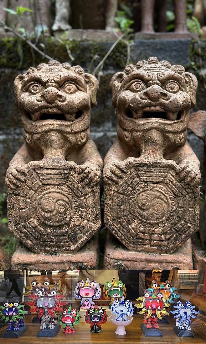 이 고양이는 '강산호(降山虎)', '강길호(降吉虎)'로도 불리는데, 말 그대로 길함을 부르는 상징이다. 진흙을 섞고, 건조해, 가마에서 굽는 방식으로 만들며, 완제품은 주로 민가의 지붕 장식에 사용되며, 마을 주민들이 복을 누리는 민속적 의미를 가지고 있다. '왕의 석공'은 이밖에도 그 지역의 소수민족 문화를 바탕으로 제품을 만들어 판다. 기자가 쿤밍 관두구전을 찾았을 때는 그 지역 소수민족인 나시족을 포함해 소수민족들의 의상을 귀엽게 만들어 놓아서 관심을 끌기에 충분했다.