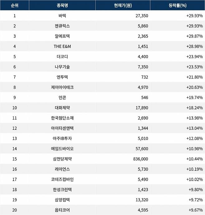 6위 나무기술(242040)은 현재가 7350원으로 23.53% 상승 중이다. 7위 엔투텍(227950)은 현재가 732원으로 21.80% 상승 중이다. 8위 제이아이테크(417500)는 현재가 4970원으로 20.63% 상승 중이다. 9위 인콘(083640)은 현재가 546원으로 19.74% 상승 중이다. 10위 대화제약(067080)은 현재가 1만 7890원으로 18.24% 상승 중이다.