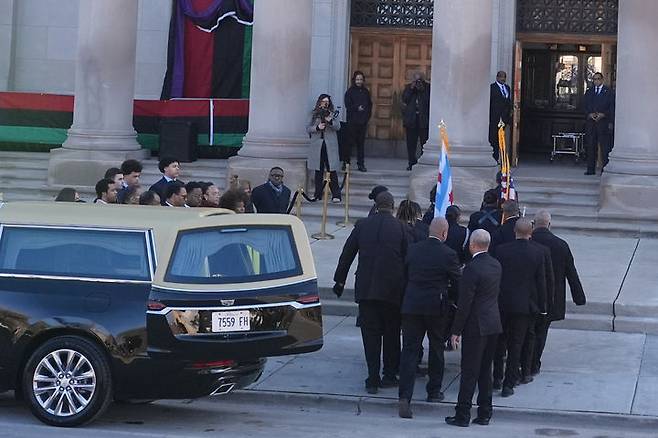[시카고=AP/뉴시스] 지난 17일 타계한 미국 흑인 민권 운동가 제시 잭슨 목사의 유해가 담긴 관이 26일(현지 시간) 영결식이 열리는 일리노이주 시카고의 레인보우 푸시 연합 본부에 도착해 운구되고 있다. 영결식은 이곳에서 이틀 동안 열린 뒤 고인의 유해는 워싱턴을 거쳐 그의 고향 사우스캐롤라이나에 안장된다. 2026.02.27.