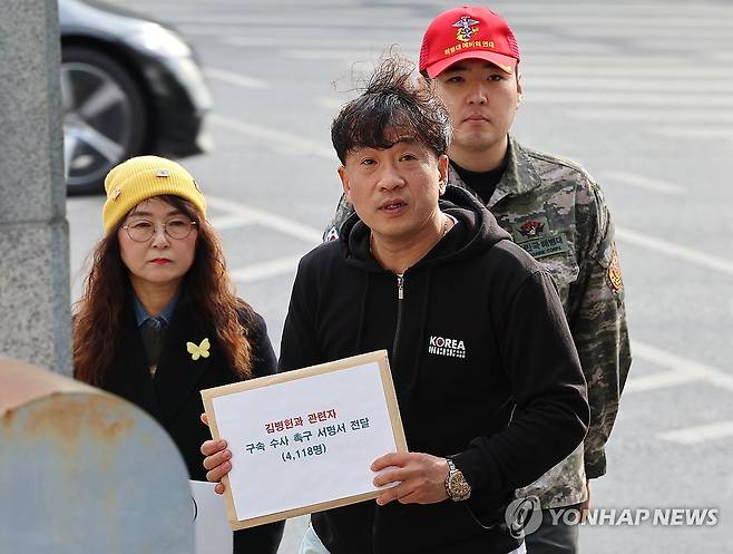 (서울=연합뉴스) 김주형 기자 = 독립유공자 김동삼 선생 후손인 김원일 일송김동삼선생기념사업회 이사와 정원철 해병대 예비역연대 회장을 비롯한 참석자들이 27일 서울 서초구 서초경찰서를 방문해 '김병헌 위안부법폐지국민행동 대표와 관련자 구속수사 촉구 서명서'를 전달하기 위해 이동하고 있다. 2026.2.27