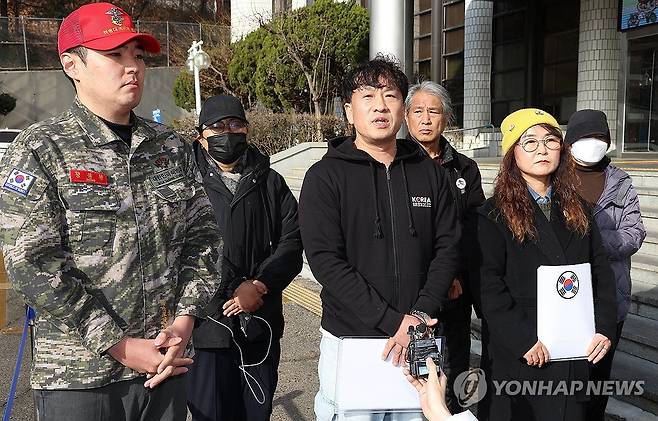 (서울=연합뉴스) 김주형 기자 = 독립유공자 김동삼 선생 후손인 김원일 일송김동삼선생기념사업회 이사와 정원철 해병대 예비역연대 회장을 비롯한 참석자들이 27일 서울 서초구 서초경찰서에서 '김병헌 위안부법폐지국민행동 대표와 관련자 구속수사 촉구 서명서'를 전달하기에 앞서 기자회견을 하고 있다. 2026.2.27