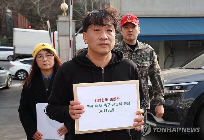 (서울=연합뉴스) 김주형 기자 = 독립유공자 김동삼 선생 후손인 김원일 일송김동삼선생기념사업회 이사와 정원철 해병대 예비역연대 회장을 비롯한 참석자들이 27일 서울 서초구 서초경찰서를 방문해 '김병헌 위안부법폐지국민행동 대표와 관련자 구속수사 촉구 서명서'를 전달하기 위해 이동하고 있다. 2026.2.27