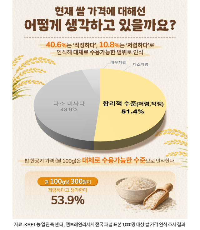 농협은 이같은 결과에 대해 “소비자들은 현재 쌀값을 충분히 수용 가능한 수준으로 인식하고 있다”며 “쌀을 단순한 소비재가 아닌 ‘식량안보 산업’으로 바라봐야 한다는 정부와 생산자단체의 지속적인 노력과 홍보가 효과를 거둔 것”이라고 분석했다.