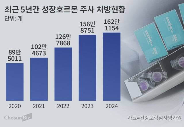 성장호르몬 열풍은 통계로도 잡힌다. 건강보험심사평가원에 따르면 19세 이하 미성년자에게 성장호르몬을 처방한 건수는 2020년 89만5011건에서 2024년 162만1154건으로 2배 가까이 뛰었다. 같은 기간 처방액도 약 597억원에서 1593억원으로 2.6배가량 증가했다.