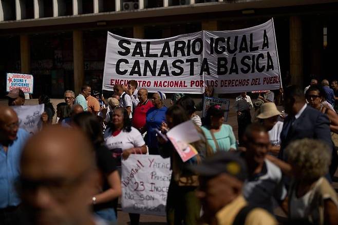[카라카스=AP/뉴시스] 26일(현지 시간) 베네수엘라 카라카스에서 연금 생활자와 간호사, 공공 부문 근로자들이 더 나은 급여와 연금, 복지 혜택을 요구하며 시위하고 있다. 2026.02.27.