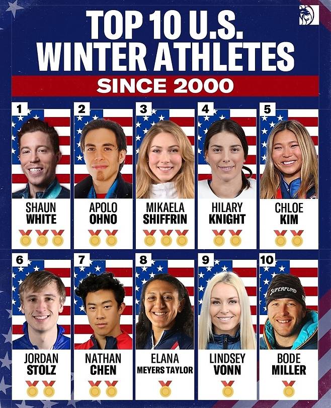 글로벌 스포츠 매체 'BetMGM'은 최근 공식 채널을 통해 2000년 이후 미국의 동계스포츠 스타 상위 10명을 선정해 공개했다.