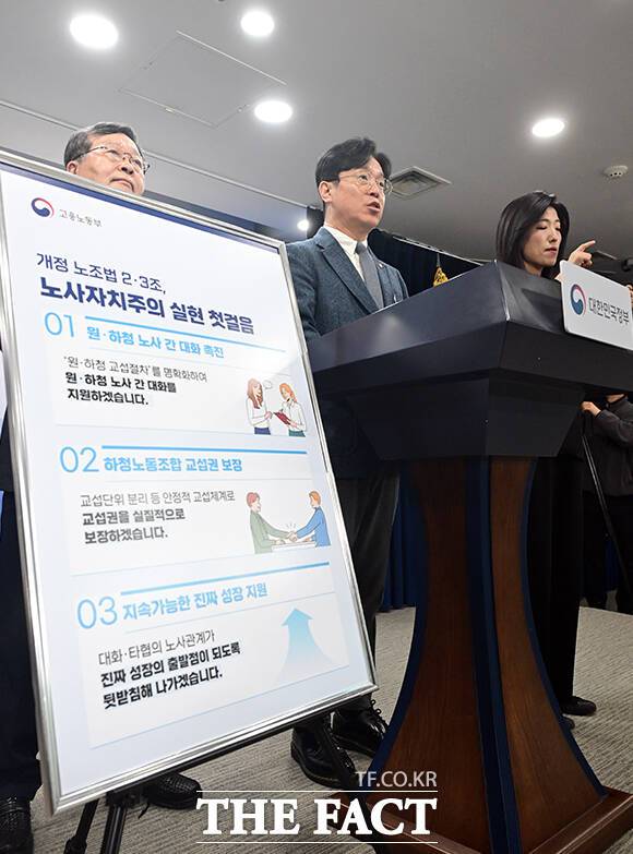 [더팩트ㅣ임영무 기자] 김영훈 고용노동부 장관(가운데)이 27일 오전 서울 종로구 정부서울청사에서 노조법 2·3조 현장 안착을 위한 브리핑을 하고 있다.