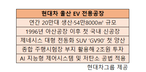 핵심 축은 현대차의 최대 생산 거점이자, 세계 최대 규모의 단일 자동차 생산기지인 울산이다. 현대차는 올해 연간 약 20만대를 생산할 수 있는 EV 전용공장을 울산에 준공한다. EV 신공장은 현대차가 1996년 충남 아산공장 이후 약 29년 만에 국내에 새로 건립하는 완성차 공장으로, 현대차는 2조3000억원을 투입해 울산 공장 내 약 55만㎡ 부지에 전기차 전용 생산 시설을 구축한다.