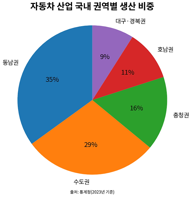 현대차그룹은 전국에 걸친 생산 거점을 기반으로 국내 자동차 산업은 지역 소득 증대 및 소비 활성화를 촉진해 왔다. 통계청의 2023년 조사에 따르면 국내 주요 산업의 권역별 생산비중(생산액 기준) 반도체는 수도권에 82%, 조선은 동남권에 80%가 집중된 반면, 자동차산업은 ▷동남권 35% ▷수도권 29% ▷충청권 16% ▷호남권 11% ▷대구·경북권 9% 등 생산이 전국에 고르게 분포돼 있다.