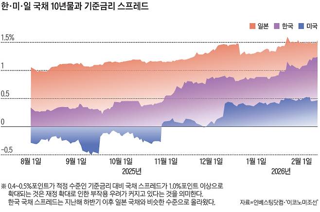 다카이치 사나에 일본 총리의 총선 대승이 확정된 2월 9일 일본 국채 10년물은 전일보다 0.062%포인트 상승한 2.286%에 거래됐다. 식료품 소비세 면제 등 다카이치 총리의 적극 재정 정책으로 국채 발행이 늘어날 것이라는 공포가 채권시장을 덮쳤다. 한국 국채 10년물도 전일 대비 0.044%포인트 오른 3.754%에 거래되면서 2023년 11월 이후 2년 2개월 만에 최고치를 기록했다. 일본 국채 40년물이 4%를 돌파하며 시장에 충격을 줬던 1월 20일의 쇼크가 재연되는 모습이었다.