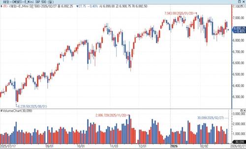 연합인포맥스 지수선물 통합화면(화면번호 6520)에 따르면 한국 시각으로 오전 9시59분 기준 E-미니 S&P500 지수 선물은 전장 대비 0.40% 하락한 6,892.25에 거래됐다.