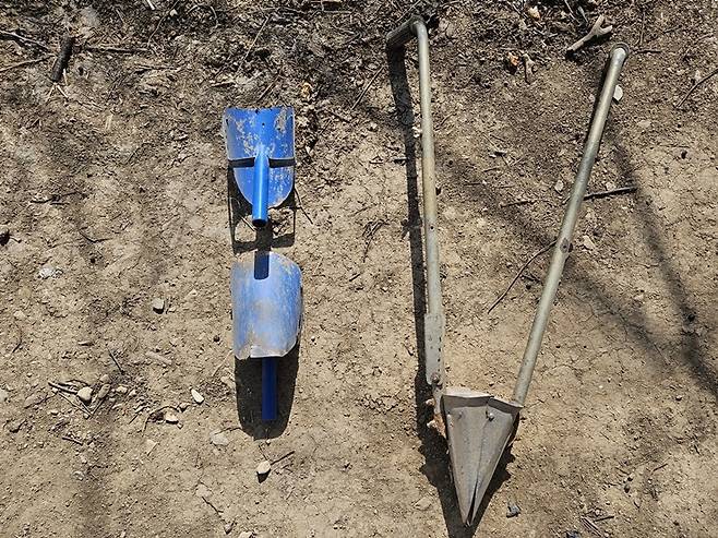 | ▲ 감자 심을 때 북삽(왼쪽)과 감자파종기를 사용하면 효율적입니다. 호미로 심는 것보다 속도가 빠르고 일정한 깊이로 감자를 심을 수 있습니다. |