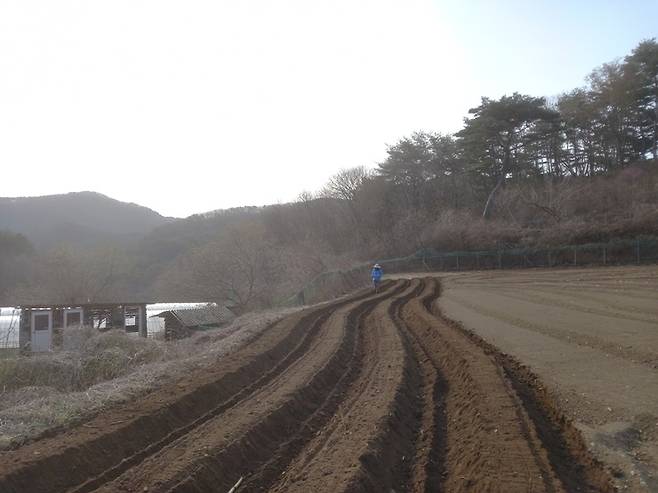 | ▲ 감자 심을 두둑을 만들고 있습니다. 퇴비와 패화석을 넣고 작은 관리기로 두둑을 만듭니다. |