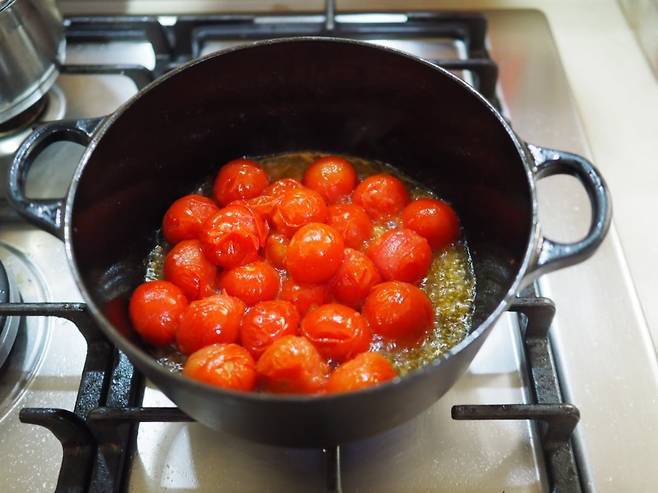5. 4의 냄비에 토마토를 넣어 가볍게 볶은 뒤 뚜껑을 덮고 약불에서 약 8분간 끓인다. 토마토의 형태가 부드럽게 무너지기 시작하면 소금과 후추로 간을 맞추고, 설탕을 더한다.