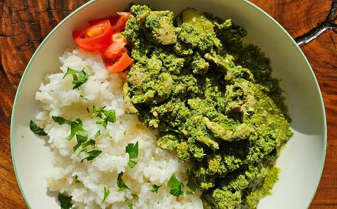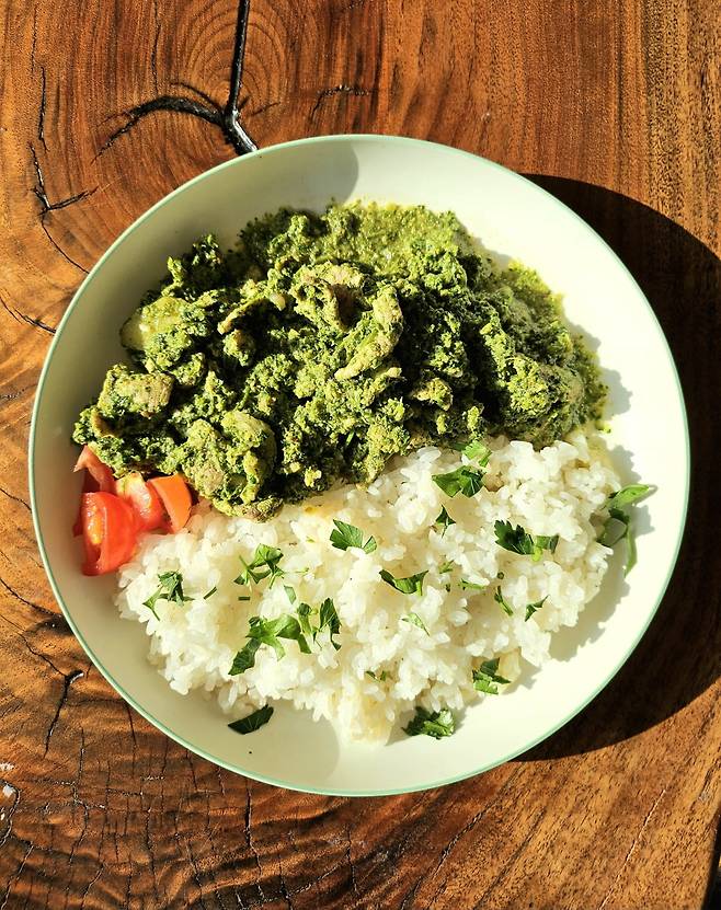 3. 그릇에 따뜻한 밥을 담고 완성된 카레를 올린다. 기호에 따라 다진 파슬리나 고수, 토마토를 곁들이면 더욱 산뜻하다.