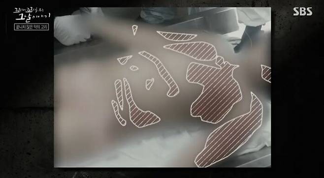 "피해자 시신이 상태가 많이 안 좋아서요. 피해자 얼굴에 폭행 흔적이 아주 심하게 있으셔서. 멍이라고 하죠. 피하출혈이 상당히 많이 얼굴에 분포돼 있었고, 숨을 쉬지 않으셨었고. 뇌경막하 출혈, '뇌출혈' 이라고 하죠. 뇌 사이에 이제 피가 고여 있는 거고요. 신체 전부위에 피하 출혈, 멍이 있었고, 늑골, 가슴, 턱 뼈가 골절된 상태셨습니다."