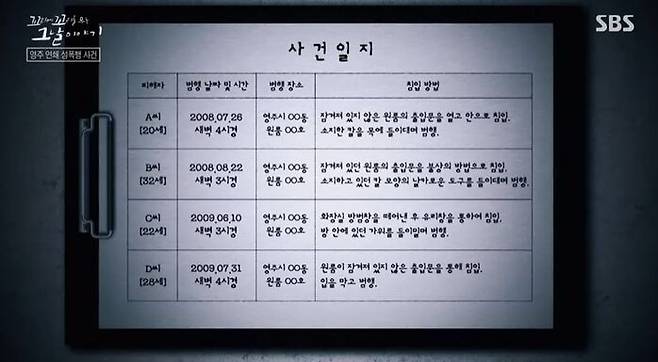 범행 시간은 전부 새벽 시간대야. 그리고 피해 여성은, 모두 원룸에 사는 2-30대 여성이야. 집에 침입한 범인은 먼저 뾰족한 도구로 피해 여성을 위협했어. 그리곤 끔찍한 범행을 저지른 거야.