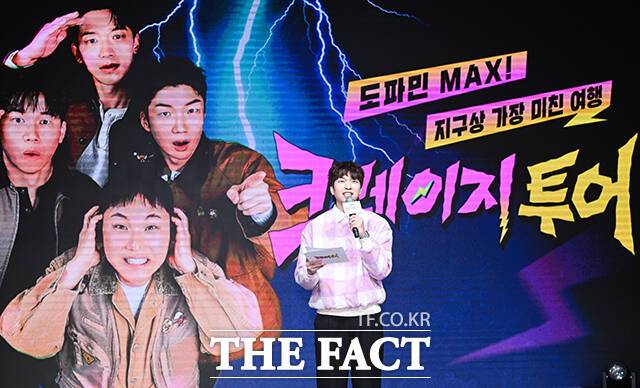 개그맨 유재필이 27일 오후 서울 마포구 상암DMC 푸르지오 S-city에서 열린 ENA 새 예능프로그램 '크레이지 투어' 제작발표회에 참석해 진행을 하고 있다.