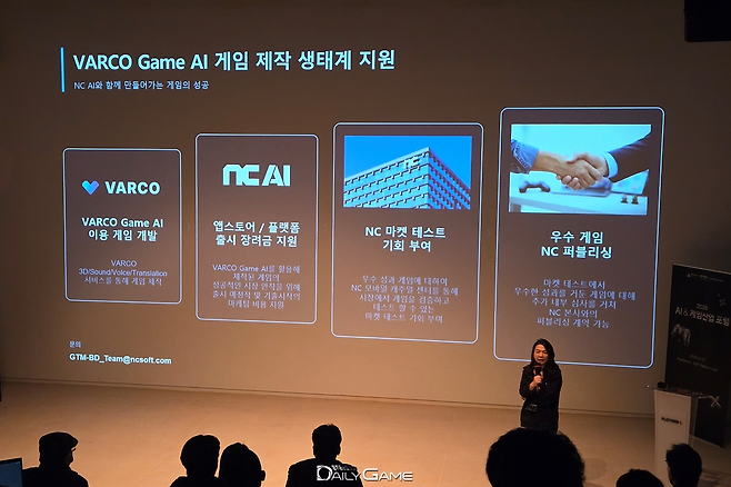 발표 말미에는 중소게임업체와 상생을 위한 지원책도 준비 중이라고 했다. 임 상무는 "2025년 공모전을 통해 바르코 게임 AI의 상용화 가능성을 테스트해왔다. 올해는 모바일 게임사까지 범위를 넓혀, AI 기술을 활용해 개발을 진행하는 팀에 공모전 비용·마케팅 비용 등을 '출시 지원금' 형태로 지원할 계획"이라고 밝혔다.