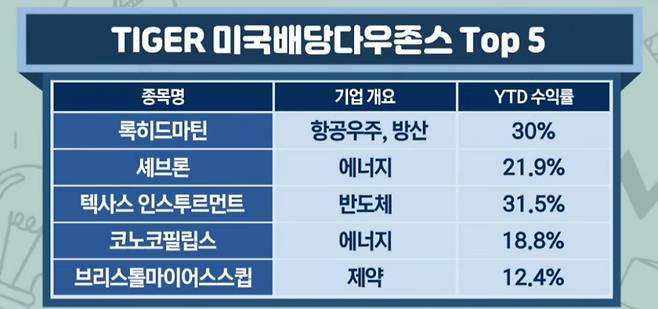 또 미국배당다우존스의 가장 큰 차별점 중 하나는 섹터가 고르게 분산되어 있다는 점입니다. 연초 이후로 수익률이 좋았던 에너지와 필수 소비재, 산업재들을 고루 담고 있는데요. 지정학적 리스크 부상하면서 강세를 보인 록히드마틴과 셰브론, 코노코필립스 등도 배당 우량주로 편입되어 있습니다.